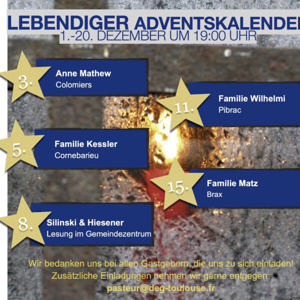 Der lebendige Adventskalender lädt dazu ein, innezuhalten und die besondere Stimmung dieser Zeit bewusst zu genießen. An einigen Abenden öffnet sich irgendwo in unserer Gemeinde ein Fenster, eine Tür oder eine Gartenpforte.