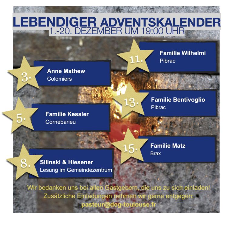 Der lebendige Adventskalender lädt dazu ein, innezuhalten und die besondere Stimmung dieser Zeit bewusst zu genießen. An einigen Abenden öffnet sich irgendwo in unserer Gemeinde ein Fenster, eine Tür oder eine Gartenpforte.