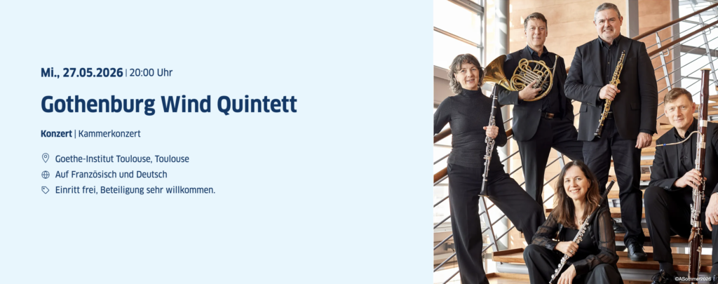 Das Gothenburg Wind Quintett wird am 27. Mai ein Konzert zu Gunsten der Kulturarbeit der Deutschen Evangelischen Gemeinde (DEG) und des Goethe-Instituts Toulouse geben, worüber wir uns sehr freuen!